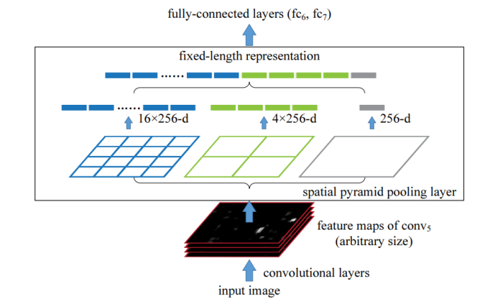 在最后的 全连接层(fully-connected layers) 之前,加入 空间金字塔池化层(spatial pyramid pooling layer) 实现固定尺寸的输出 ;