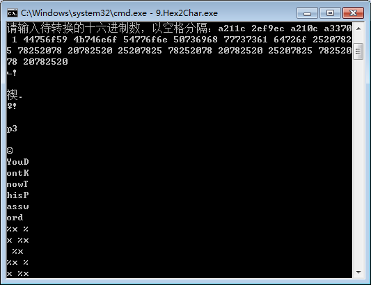 运行Hex2Char,输入登录程序打印出的一系列十六进制数,程序的运行结果如图9-36所示: