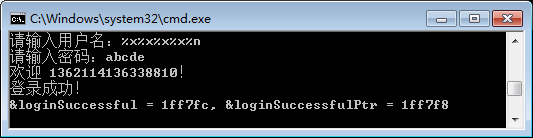 391 printf("登录成功!\n&loginSuccessful = %x, &loginSuccessfulPtr = %x\n", &loginSuccessful, &loginSuccessfulPtr);