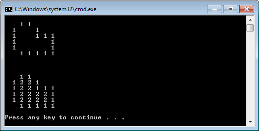 在例程中,像素点一共有4种可能的状态:0表示底色,1表示边界, color表示要上的颜色,inQueue表示像素点已经在队列中,等待被处理(处理完之后像素点的值从inQueue变成color)。inQueue可以避免同一个像素点被反复加入到队列中。