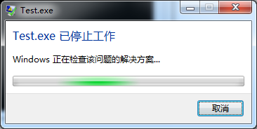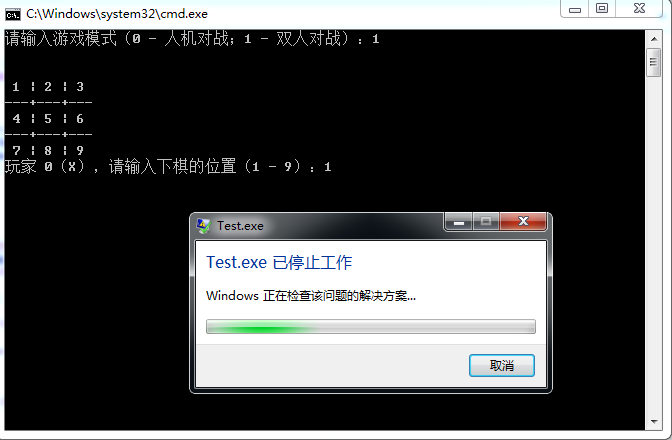 大黄在使用自己编写的井字游戏与人对弈时,遇到了下面的提示窗口(大黄的操作系统为Windows 7,他的井字游戏的可执行文件名为Test.exe):