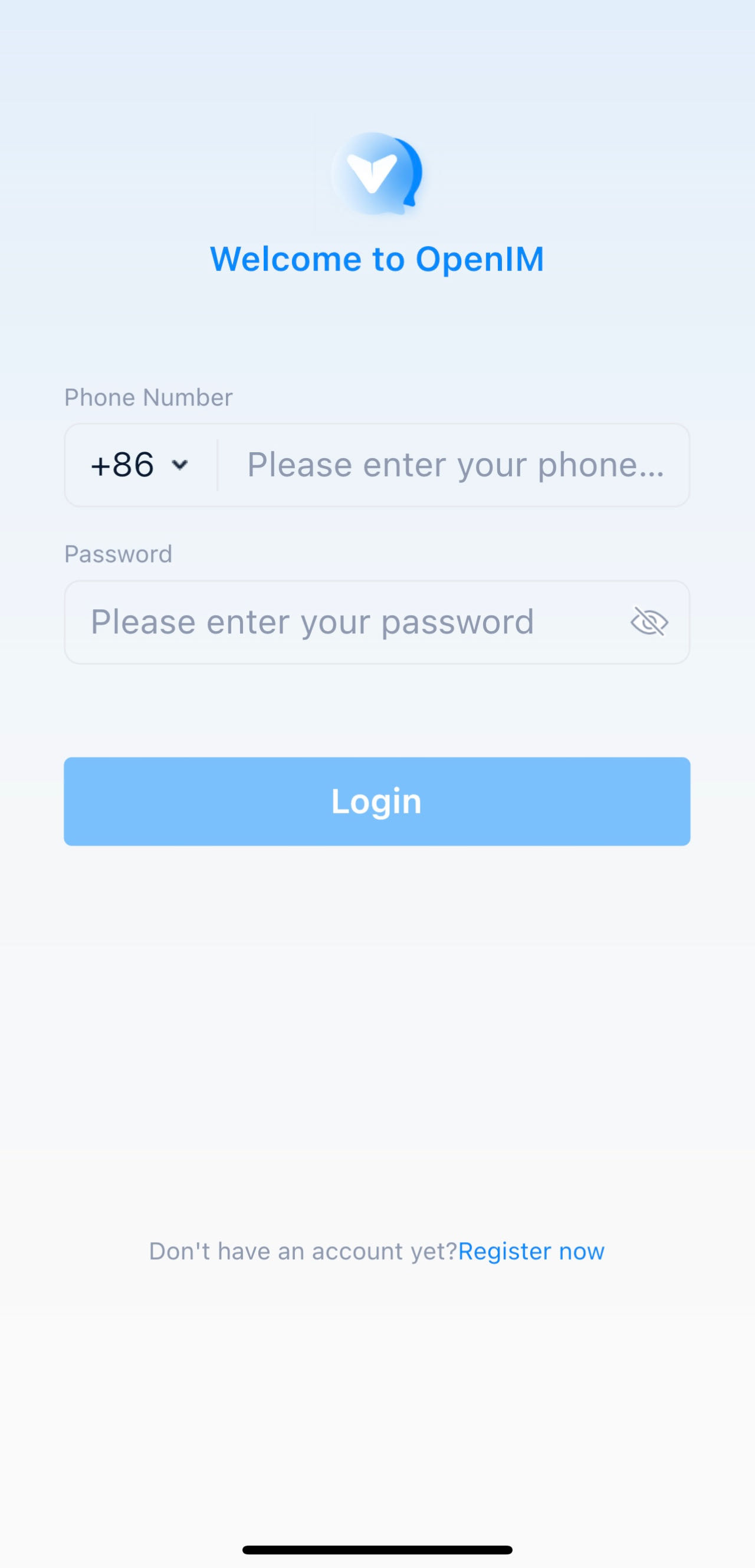 Note: Double-click on OpenIM and modify the IP to the server’s OPENIM_IP, then restart the App. Please ensure relevant ports are open and restart the App after modification. Register via mobile phone for first-time use, the default verification code is 666666.