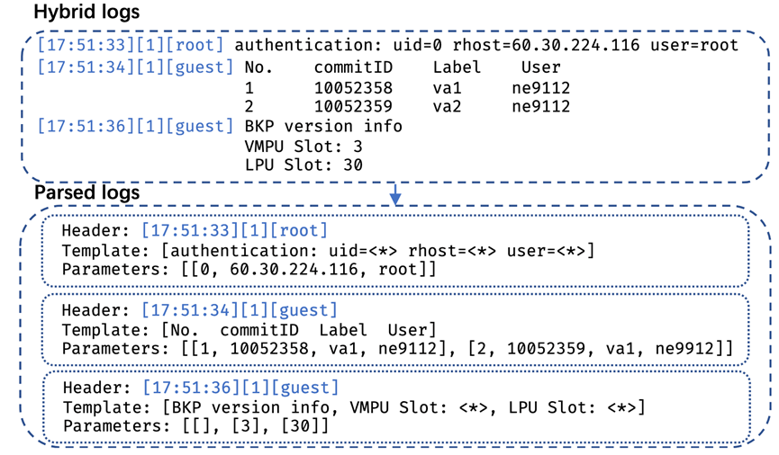 此外,本文同样定义了混合日志解析任务的目标是区分混合日志中的消息类型,并提取不同日志消息的公共部分作为日志模版。与传统日志解析相比,混合日志解析是一个更通用、覆盖面更广的研究问题,当日志中所有消息都是单行的事件日志时,混合日志解析任务退化为传统单行日志解析任务,即传统日志解析任务是混合日志解析任务的一个子集。混合日志解析任务如图中所示。