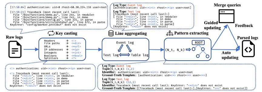 本文提出了一种全新的混合日志解析器Hue。Hue是一种无监督的在线日志解析器,它利用启发式解析树和高效的人工反馈机制,使其既能自动化地高效解析混合日志,也能根据使用者的需求反馈高精度地解析混合日志。具体而言,Hue首先通过聚合混合日志的相邻行的方式,再挖掘日志的行间特征,从而确定日志的消息类型;之后,Hue通过使用解析树的启发式规则,挖掘聚合后的日志行的行内特征,从而确定日志消息的具体模版。除全自动解析模式以外,Hue也允许根据使用者的反馈进行半自动的解析。Hue将自动识别可能具有多种解析结果的日志消息,并向用户抛出反馈请求,以及时修正解析过程。Hue的工作流程如图所示。
