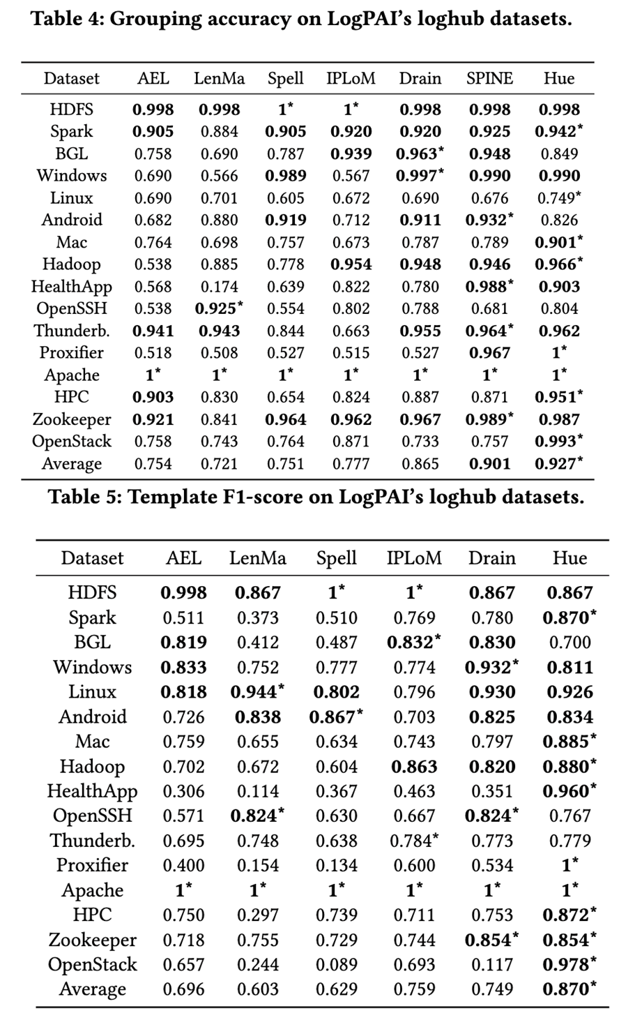 本文也评估了Hue在传统的单行日志解析任务上的精度。如Table 4和Table 5所示,本文依然沿用Group Accuracy(GA)和F1-Score指标对Hue在全自动模式下的解析能力进行评估。结果显示即使没有引入任何人工反馈,Hue也能超越现有的日志解析器。