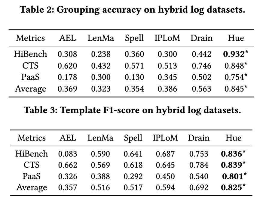 如Table 2和Table 3中所示,本文使用Group Accuracy(GA)和F1-Score上评估了Hue在全自动模式下的混合日志解析精度。考虑到Hue是第一个具备解析混合日志的解析器,且现有日志解析器无法解析混合日志,本文在测试其他解析器时将所有多行日志数据拉平为单行之后再对现有解析器进行评估。从图中可以看出,由于拉平过程破坏了多行日志的行间特征,导致现有解析器完全无法正常完成混合日志的解析。