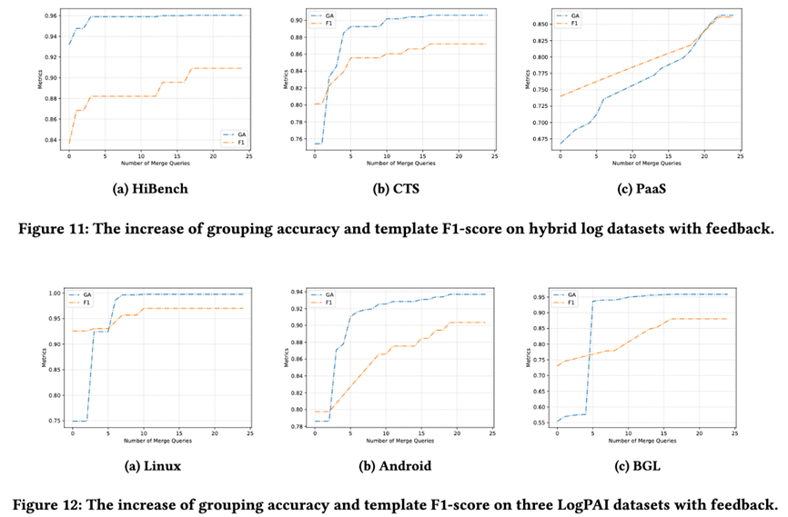 此外,本文评估了在允许使用人工反馈的前提下,Hue在混合日志和单行日志上的解析精度的提升能力。如Figure 11和Figure 12图中所示,Hue在正确的人工反馈的指导下,解析精度仍然能进一步提升。
