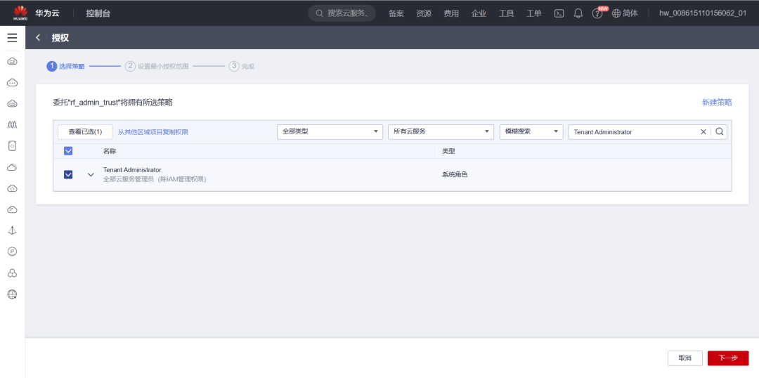 在搜索框中输入“Tenant Administrator”权限,并勾选搜索结果,单击“下一步”。
