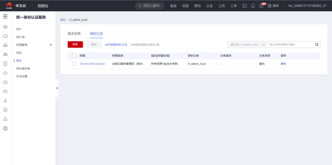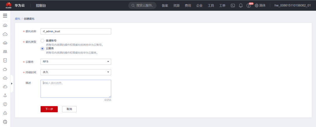 界面中的“创建委托”按钮,在委托名称中输入“rf_admin_trust”,委托类型选择“云服务”,输入“RFS”,持续时间“永久”,然后单击“下一步”。