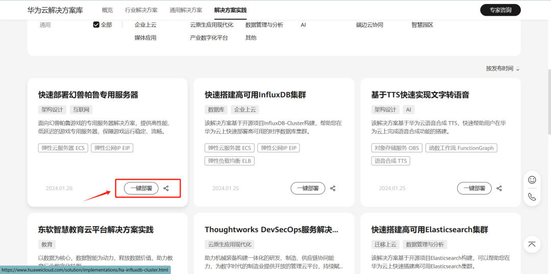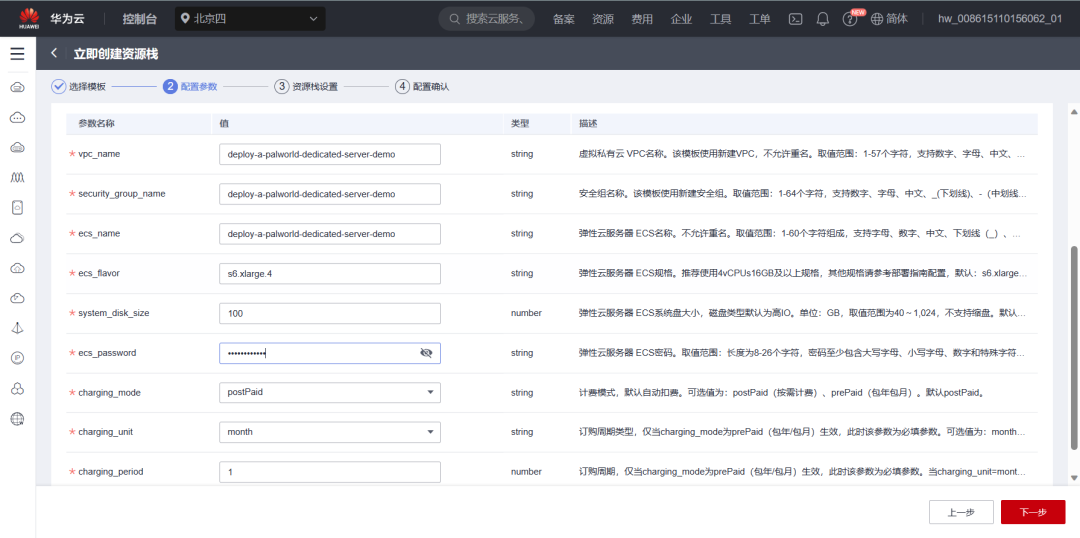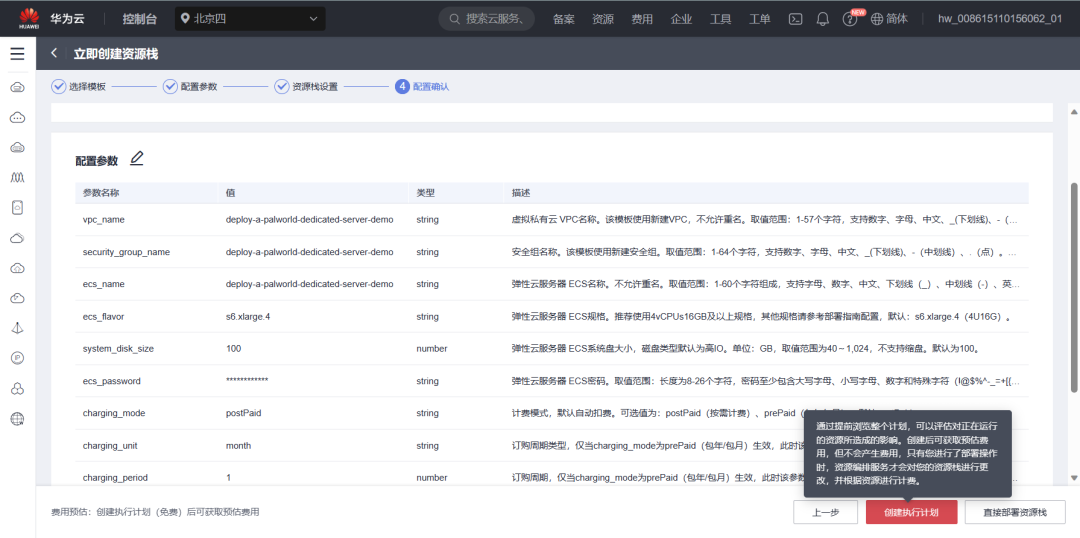 下面就正式进入我们的一键部署的实战了!打开华为云官网,找到快速部署幻兽帕鲁专用服务的页面,数据中心下拉菜单可以选择需要部署的区域,单击“一键部署”,跳转至解决方案创建堆栈界面。
