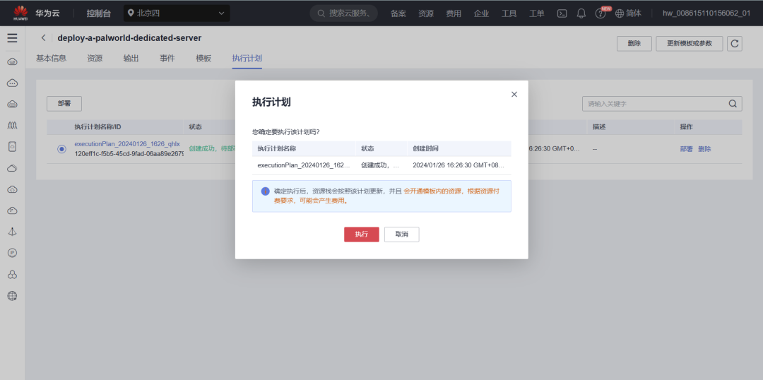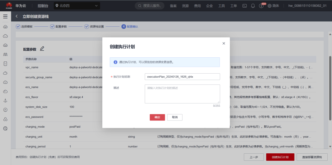 在配置确认页面中,单击“创建执行计划”。在弹出的创建执行计划框中,自定义填写执行计划名称,单击“确定”。