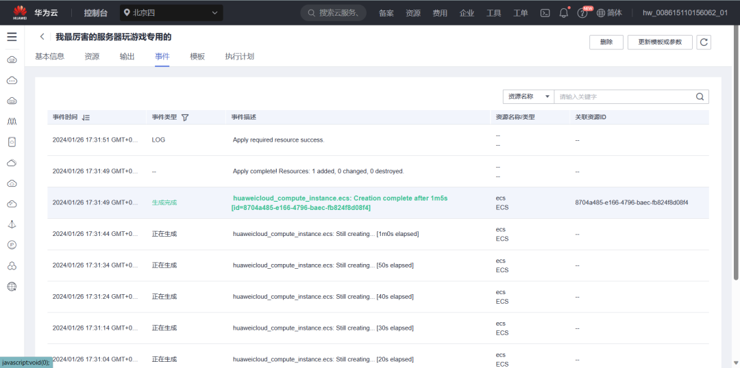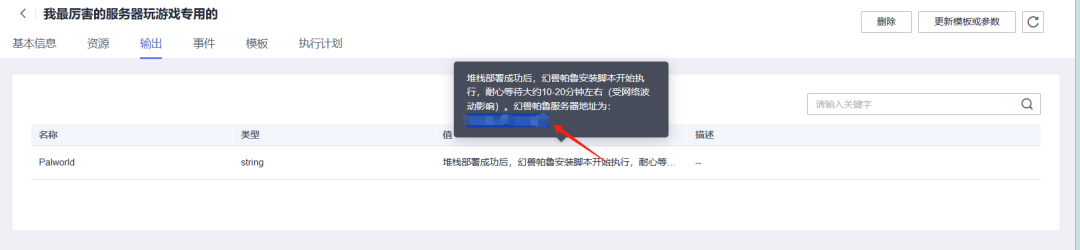 启动成功后,我们去“控制台”,找到“堆栈”,找到你刚才建立的资源栈中的名称,点进去。然后从“输出”选项那里,鼠标移过去就出现了你的幻兽帕鲁的服务器地址了,把它保存下来。至此,我们就可以关闭浏览器,安心地去见“帕鲁”了。