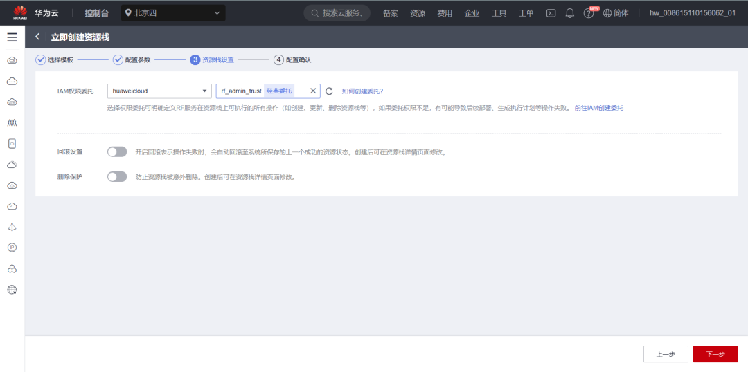 完成后,我们就可以在资源设置界面中,在权限委托下拉框中找到刚才我们在准备活动中“rf_admin_trust”委托,单击“下一步”。