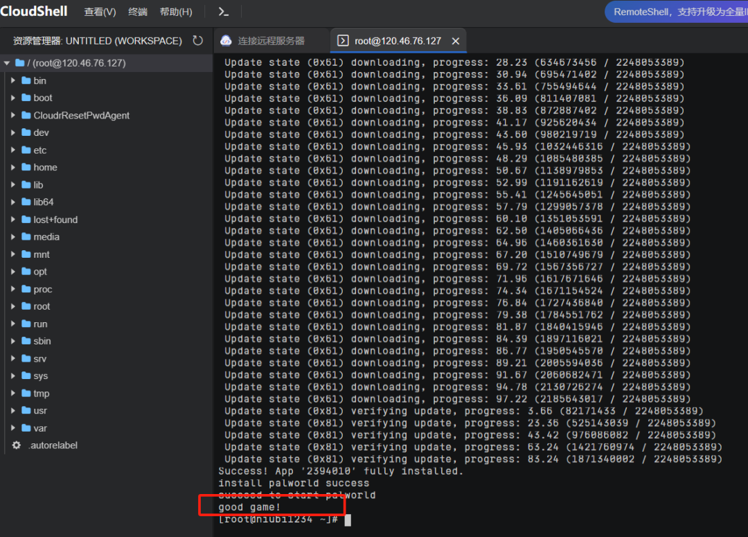 这是一个脚本的命令,粘贴进去直接按回车。一直等待“good game”的字样出现后,恭喜你,你的部署已经完成了。这里需要注意的是,有些小伙伴可能在安装幻兽帕鲁专用服务器时,由于网络波动问题可能会运行失败,如果失败了会自动重试几次。