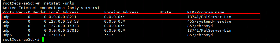 如果“good game”的字样出现后你还是不放心,你也可以输入netstat -ulpt命令,检查幻兽帕鲁服务器的8211端口是否启动成功。