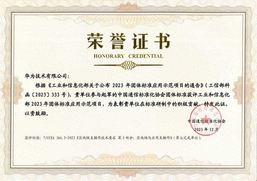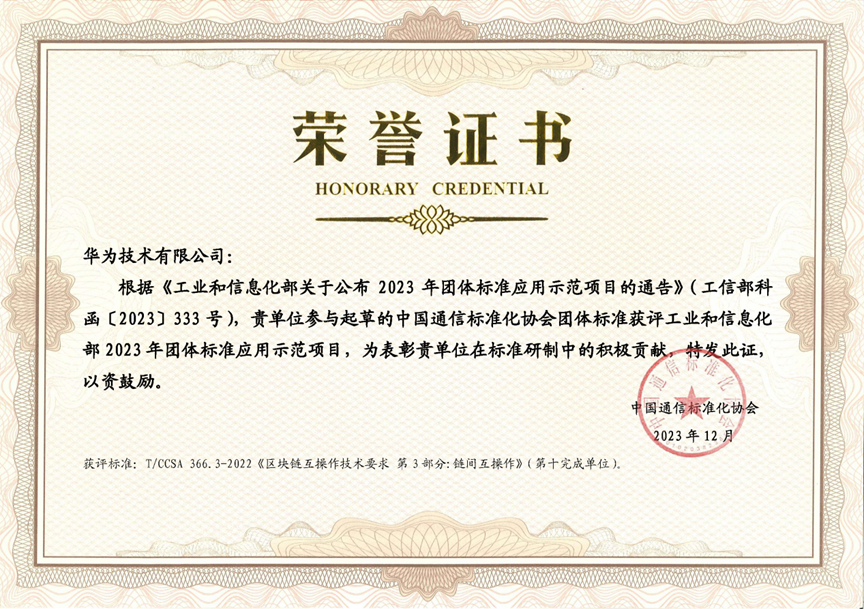 该三项标准荣获中国通信标准化协会颁发的「工业和信息化部2023年团体标准应用示范项目」,是我国在区块链互操作领域的首批标准,也是国际上较早发布的区块链互操作标准,对于推动区块链技术和应用的创新发展,提升区块链领域话语权、影响力,具重要战略意义。