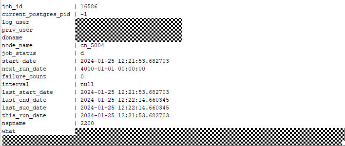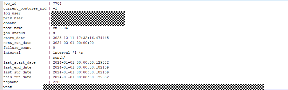 状态二:当job排到队开始执行时,job_status即任务的状态会刷新为r,current_postgres_pid刷新为运行此任务的postgres线程ID,start_date和this_run_date会刷新为当前时间,若下次不执行next_run_date刷新为'4000-01-01 00:00:00',若下次继续执行则next_run_date刷新为下一次执行的时间。