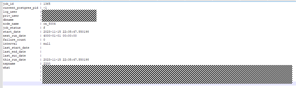 状态一:当时间到达job任务的next_run_date时间,job任务会进入任务队列,单个cn的job并发上限受到job_queue_processes的 限制,默认为10,超出该限制的任务会进行排队,此时job_status即任务的状态为f,start_date为创建job时传入的开始时间参数,start_date和next_run_date的值都为空,this_run_date的值也为空(当开始执行时该字段会进行刷新)。