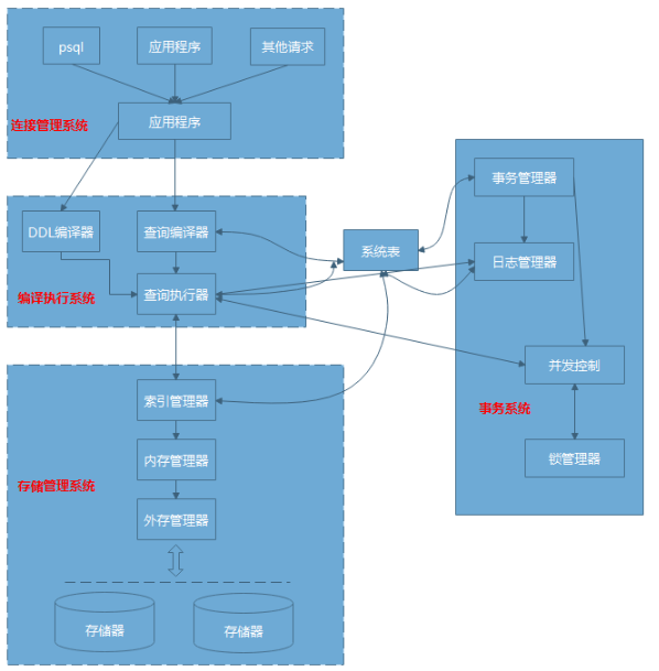 服务进程Postgres 接受并执行客户端发送的命令,在底层模块(如存储、事务管理、索引等)之上调用各个主要的功能模块(如编译器、优化器、执行器等),完成客户端的各种数据库操作