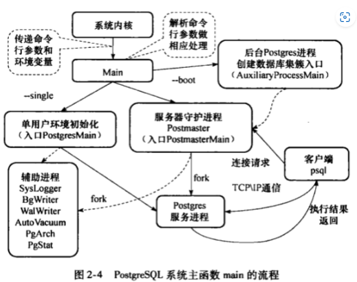 PostgreSQL系统采用C/S模式,为每个客户端分配一个后台服务进程Postgres。一次PostgreSQL会话由下列进程组成: