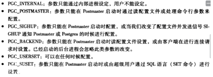 六种类型(通过枚举类型GucContext定义),并且只能在合适的环境下进行配置: