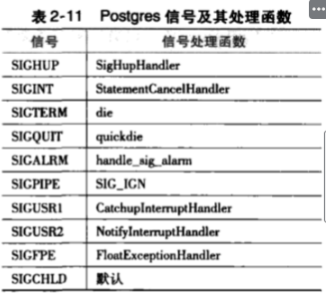 Postgres中信号的注册方式和Postmaster类似,因此这里只对Postgres中处理的信号及其意义进行介绍,其中有几个重要的信号处理函数意义如下: