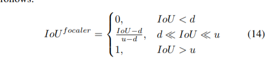 其中IoUfocaler是重构后的focer -IoU, IoU是为原IoU值,[d, u]∈[0,1]。通过调整d和u的值,我们可以使IoUfocaler关注的焦点不同回归样本。其损失定义如下: