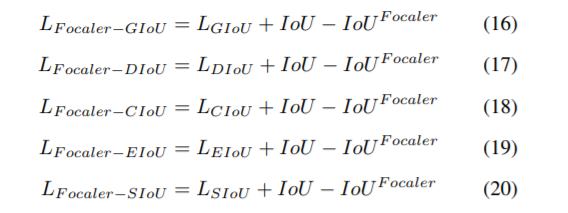 IoU的边界盒回归损失函数,分别为LFocaler−GIoU、LFocaler−DIoU、LFocaler−CIoU、LFocaler−EIoU和LFocaler−SIoU如下: