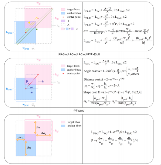 图2所示。基于IoU的损失。(a)和(b)中的损失函数都使用诸如锚框和目标框的最小外部边界框(灰色虚线框)的对角线长度或面积等维度信息作为损失因子的分母。相反,(c)中的PIoU损耗仅使用目标盒的边缘长度作为损耗因子的分母。