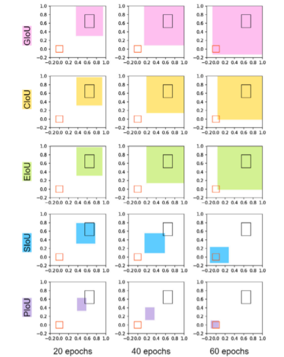图1所示。基于不同iou的损失函数指导下的锚框回归过程。彩色框是在回归过程中由不同损失函数引导的锚框。很明显,以PIoU损失为导向的锚盒是最快回归到接近目标盒的。此外,除PIoU损失外,所有损失函数引导的锚盒都存在面积扩大问题,而PIoU损失引导的锚盒则不存在面积扩大问题。