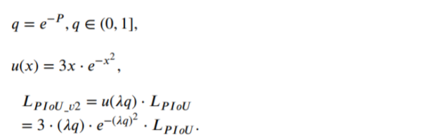 在本节中,我们将探讨聚焦机制在我们提出的损失函数中的应用。为了解决第2.2节中提到的Focal EIoU (Zhang, Ren et al., 2022)和WIoU (Tong et al., 2023)的局限性,我们设计了一个由单个超参数控制的非单调注意函数与PIoU相结合。PIoU v2损耗在PIoU损耗上增加注意层后得到,增强了对中高质量锚盒的聚焦能力,提升了目标检测器的性能。注意函数和PIoU v2损失定义为: