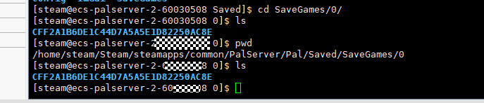 4. 查看/home/steam/Steam/steamapps/common/PalServer/Pal/Saved/SaveGames/0 下的游戏存档目录,确定需要恢复的存档,如: