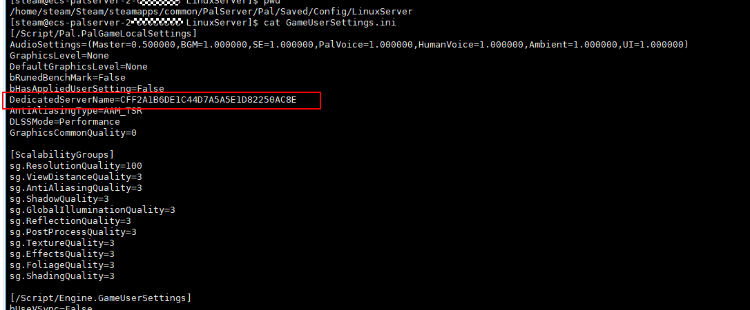 确定该存档目录名与/home/steam/Steam/steamapps/common/PalServer/Pal/Saved/Config/LinuxServer/GameUserSettings.ini文件中的DedicatedServerName保持一致,该配置是存档可以正确读取的关键: