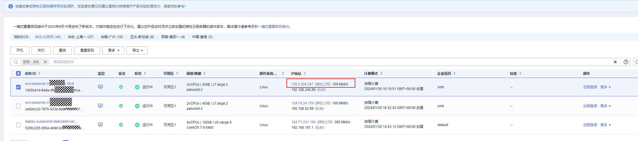 A:登录华为云服务器控制台 :找到palworld服务端所在的服务器,获取该服务器的弹性公网IP,如下: