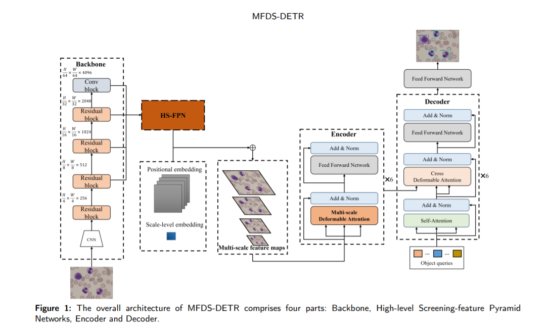 该架构名为MFDS-DETR(多级特征融合与可变形自注意力DETR),旨在解决检测尺度不同且在图像中可能特征有限的白细胞的挑战。