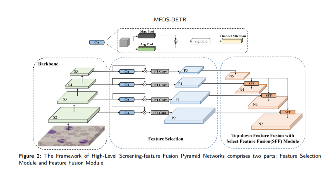 为了解决白细胞数据集固有的多尺度挑战,我们开发了基于层次尺度的特征金字塔网络(HS-FPN)来完成多尺度特征融合。这使得该模型能够捕获更全面的白细胞特征信息。HS-FPN的结构如图2所示。HS-FPN主要由两个部分组成:(1)特征选择模块。(2)特征融合模块。最初,不同尺度的特征图在特征选择模块中经过筛选过程。随后,通过选择性特征融合(Selective feature Fusion, SFF)机制,将这些特征映射中的高层和低层信息协同集成。这种融合产生的特征具有丰富的语义内容,这有助于检测白细胞显微图像中的细微特征,从而增强模型的检测能力。进一步阐述这种SFF机制及其对模型性能的影响将在随后的烧蚀研究部分提供。