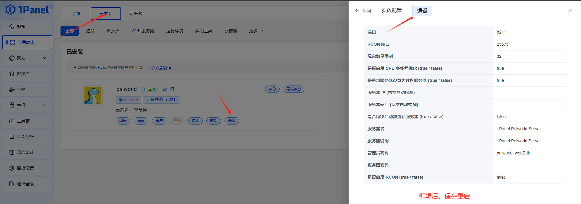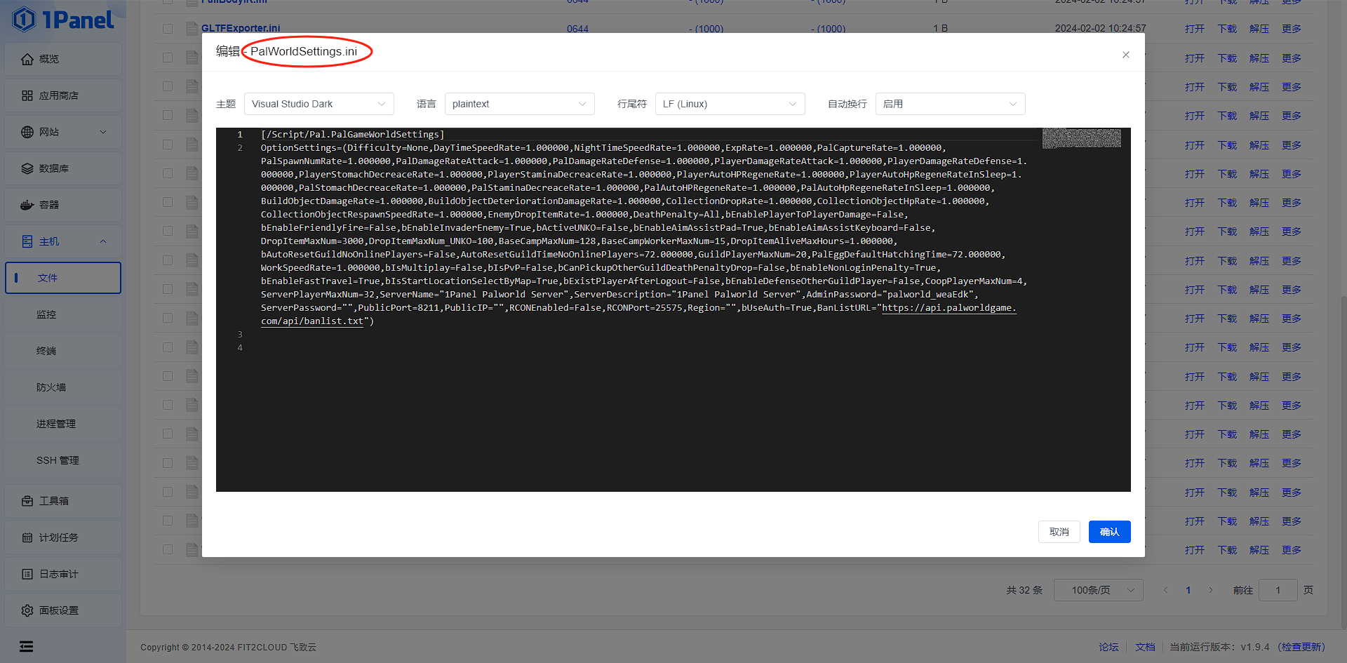 找到PalWorldSettings.ini 双击打开,修改对应参数保存,然后 按照第一步重启服务。