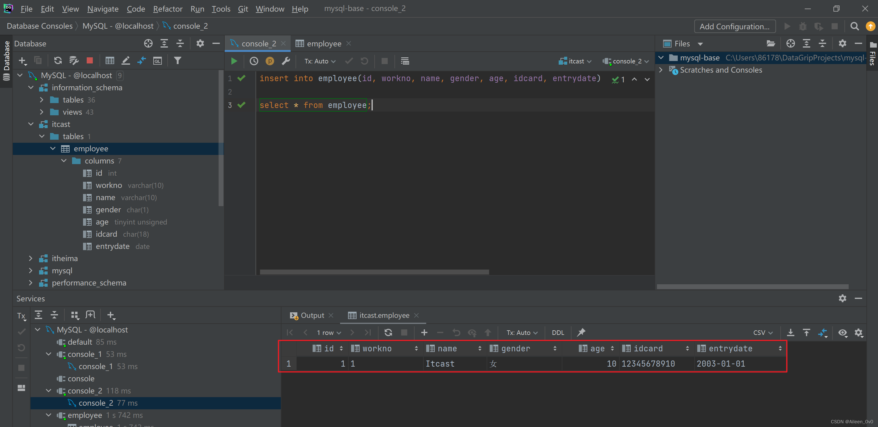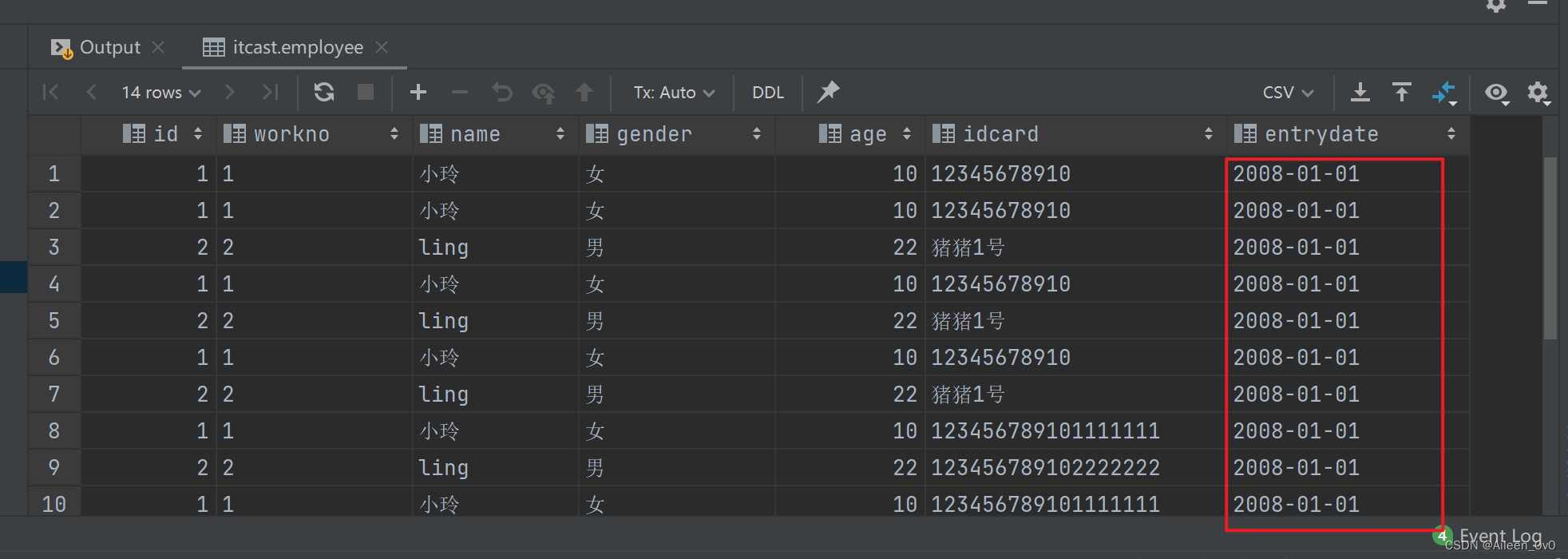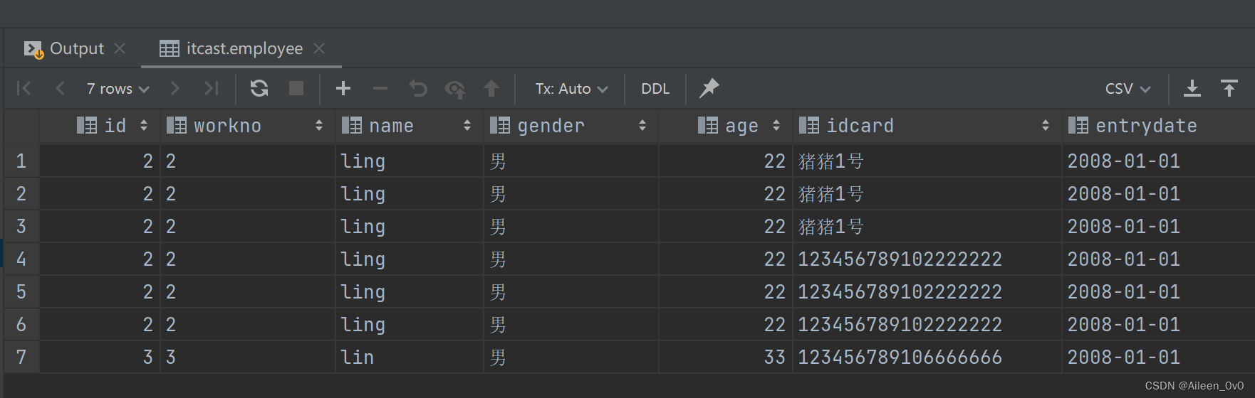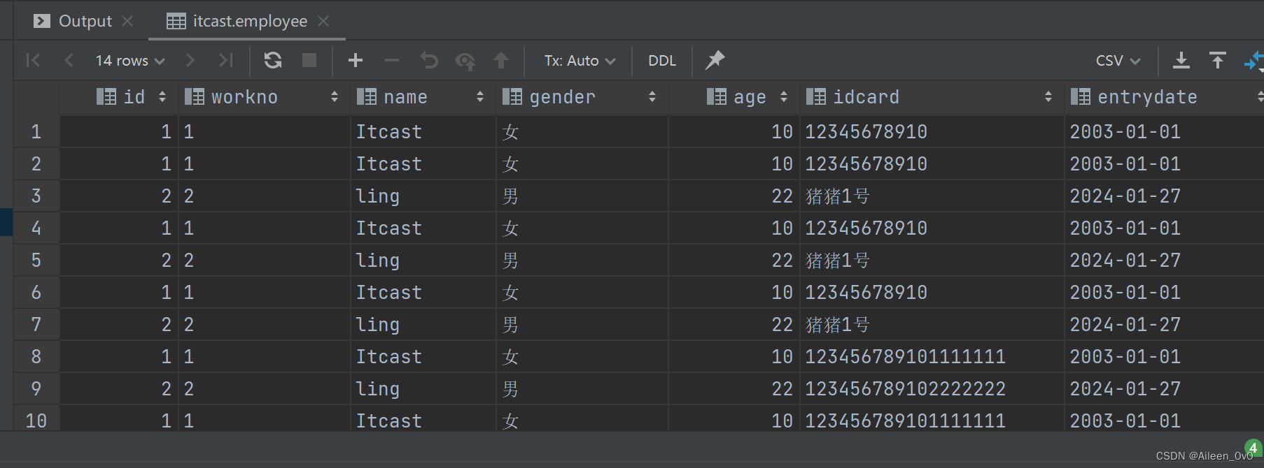 insert into employee(id, workno, name, gender, age, idcard, entrydate) values (1,'1','Itcast','女',10,'123456789101111111','2003-01-01');