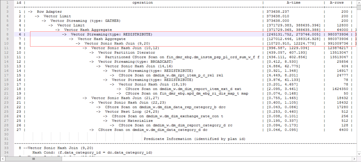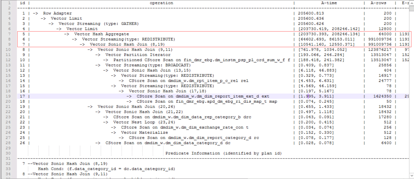 执行时间在最下边这一层Vector Hash Aggregate耗时过多且聚合后行数减少程度不大
