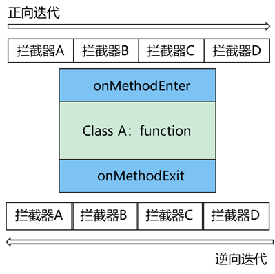 Sermant的设计中,通过字节码增强引入的服务治理能力,是通过在目标方法上添加服务治理功能切面来完成的,每一个服务治理插件,通过一系列切面的配合来达成最终的服务治理效果。不同的服务治理功能,可能会对同一个目标方法进行处理。但并不会对同一个方法进行多次字节码增强,而是通过一次字节码增强织入调度切面(onMethodEnter、onMethodExit等),通过该切面对相关的服务治理能力(通过拦截器实现,每一个切面会对应一个拦截器的列表)进行调度: