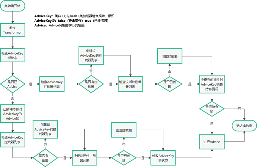 基于字节码增强锁,在转换器触发时,主要有两条路径可以走,类文件转换器会通过目标方法的AdviceKey(类名+方法hash+类加载器组成的一个唯一表示,用于表示字节码增强的目标)来检查其所关联的锁,判断当前目标方法是否已被Sermant进行过字节码增强(织入拦截器调度的切面):