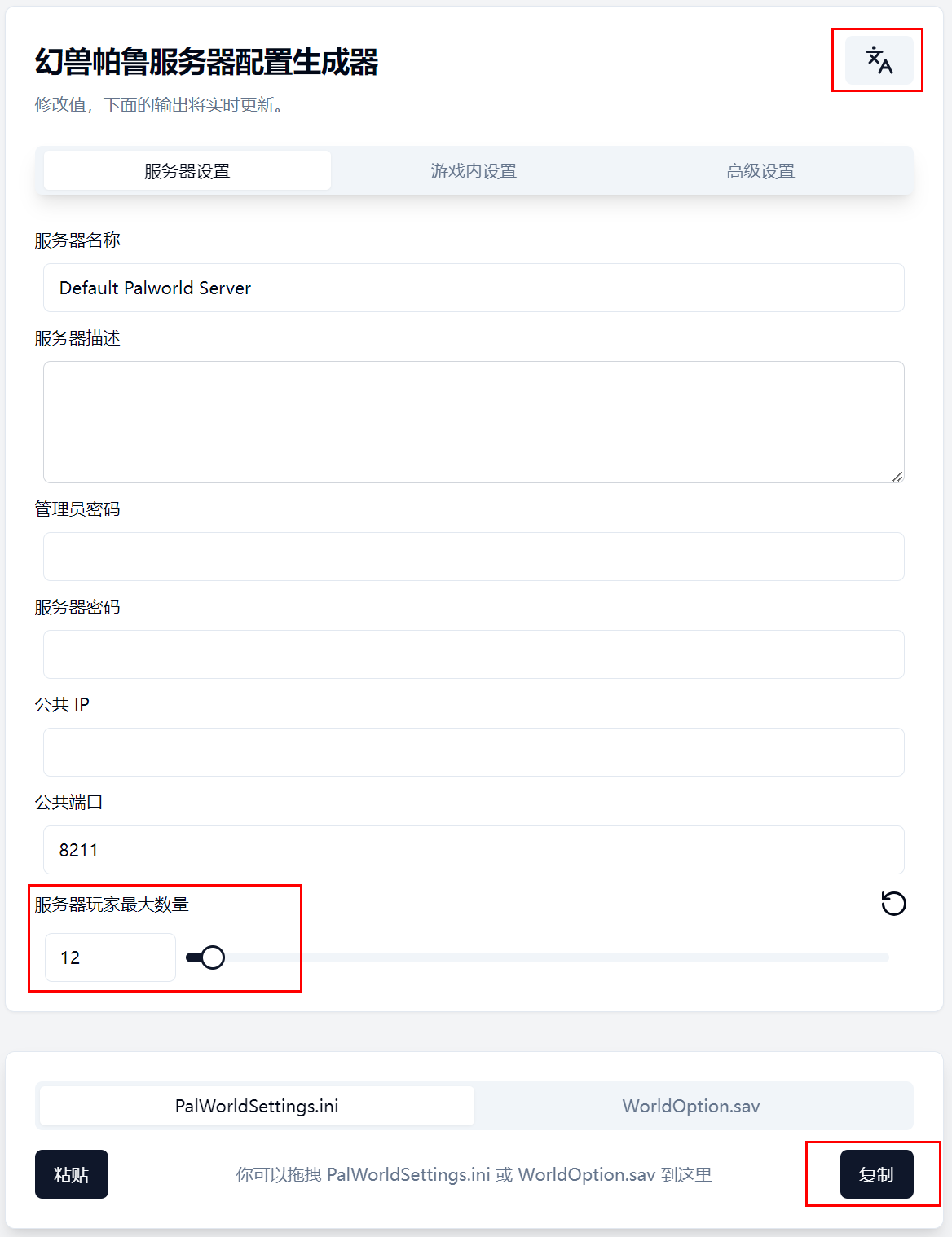进入帕鲁官方文档(https://pal-conf.bluefissure.com/ )设置您想要的配置,本次演示配置“服务器玩家最大数量”, 复制您定制的参数。