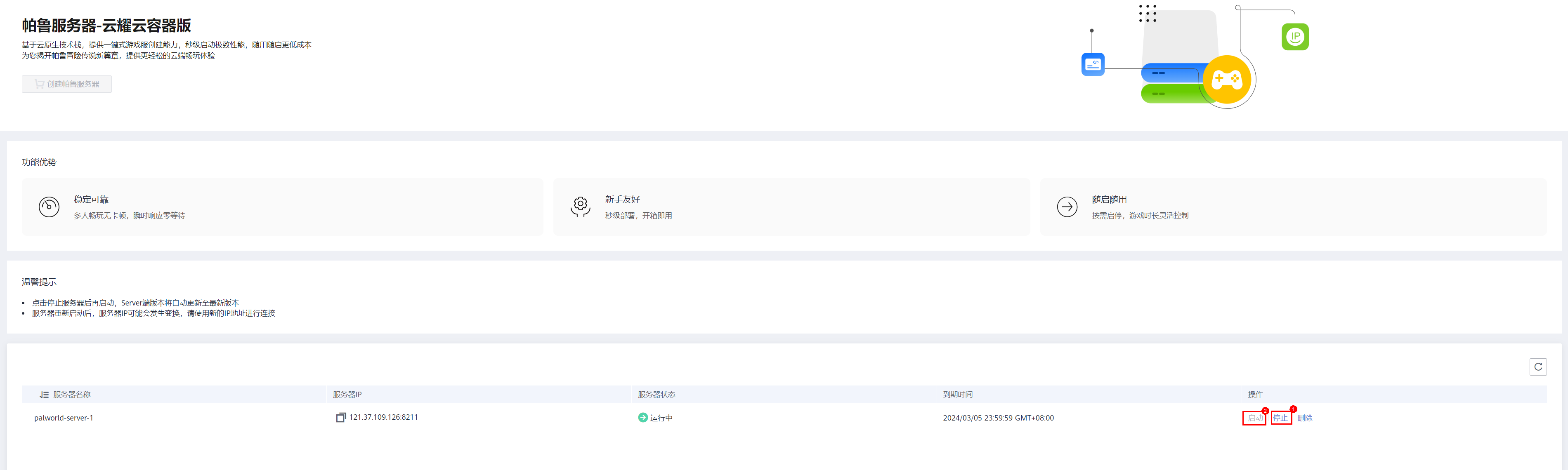 5. 回到帕鲁服务器控制台(链接:https://console.huaweicloud.cn/cci/?region=cn-north-9&locale=zh-cn#/palworld/list),重启服务器(停止->启动)
