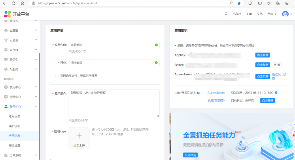 需要记录AppKey、Secret、AccessToken(1周1更新,建议用代码调用保存)