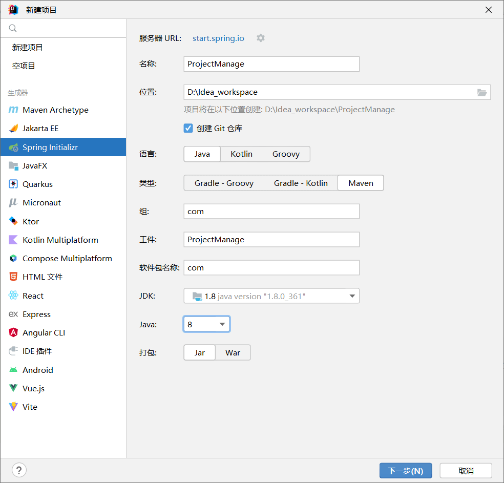 ② 指定项目存储位置(根据需要勾选是否创建Git仓库)