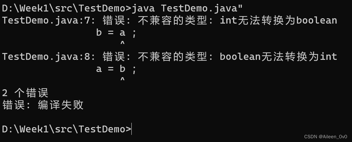 根据上面运行结果,我们可以得出: int 和 boolean 是毫不相干的两种类型,不能相互赋值.