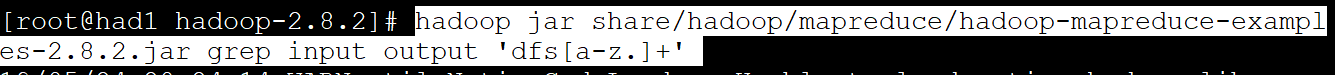 hadoop jar share/hadoop/mapreduce/hadoop-mapreduce-examples-2.8.2.jar grep input output 'dfs[a-z.]+'