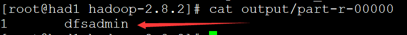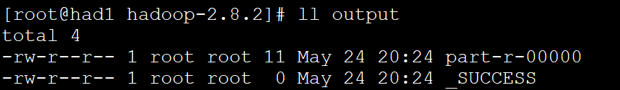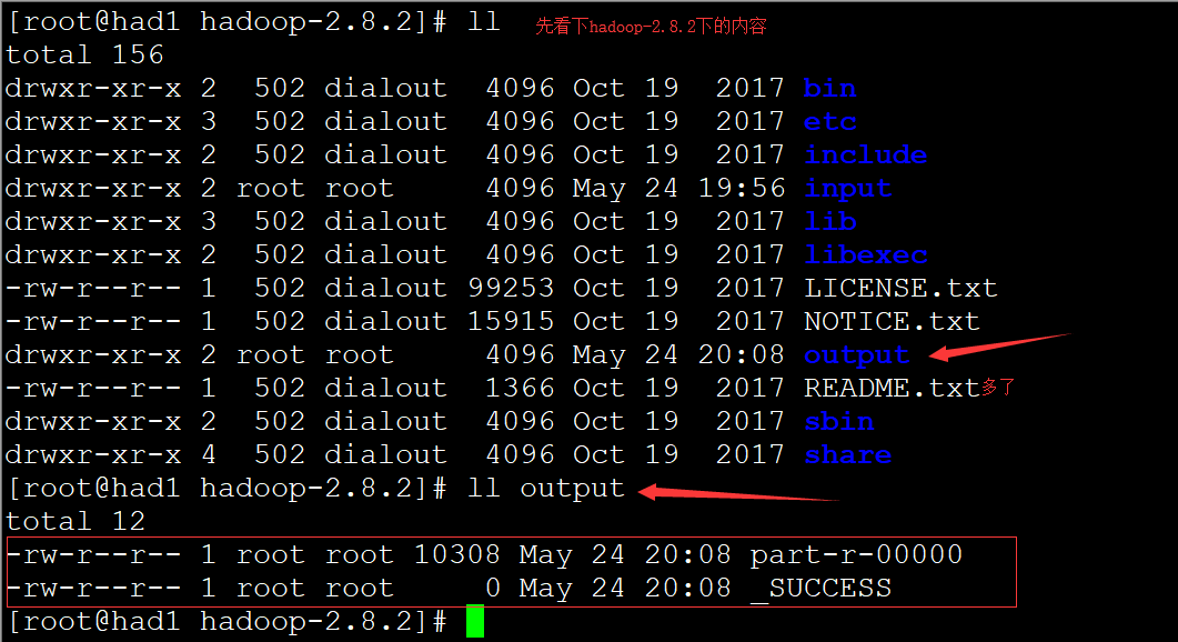 会发现多出了在当前hadoop-2.8.2的目录下多了output的目录。查看output下的内容发现有两个文件。