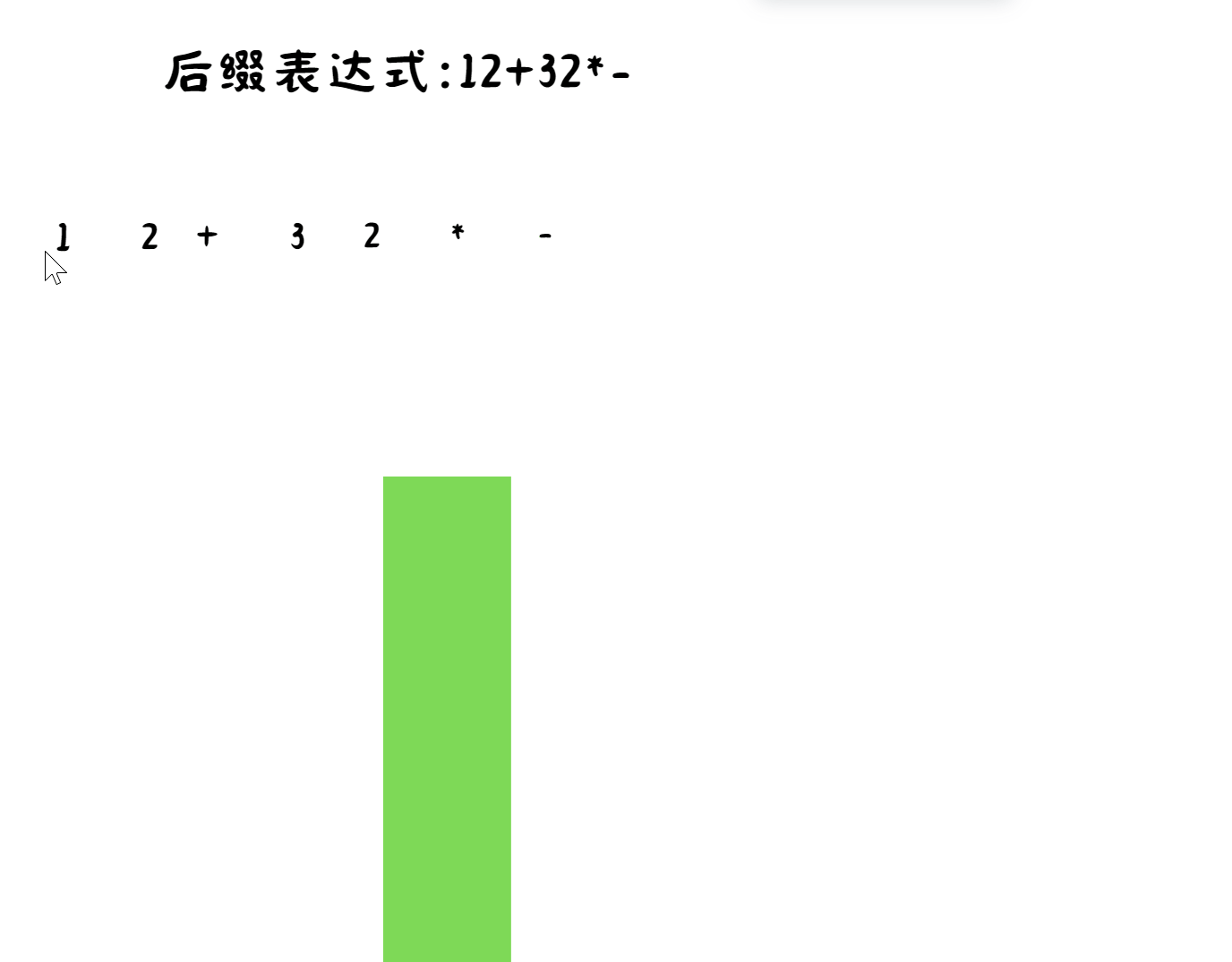 计算后缀表达式的动态流程如下,以1+2-3*2的后缀表达式为例: