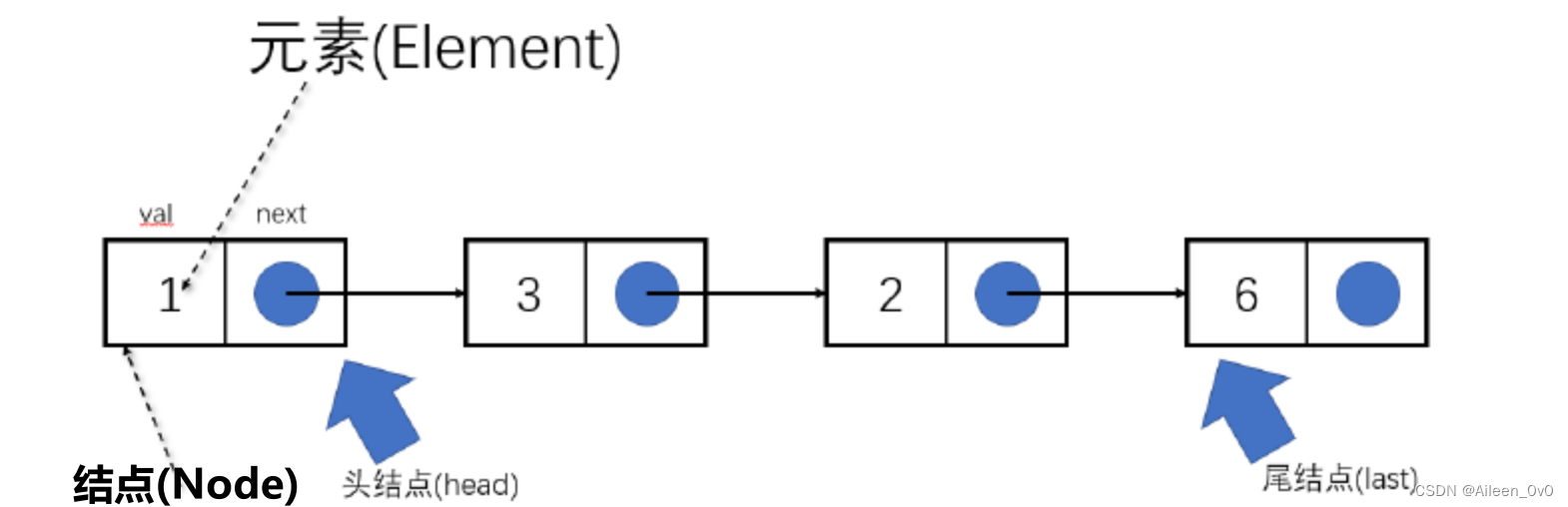 结点(node): 为了组织链表而引入的一个结构,除了保存我们的元素之外,还会保存指向下一个结点的引用